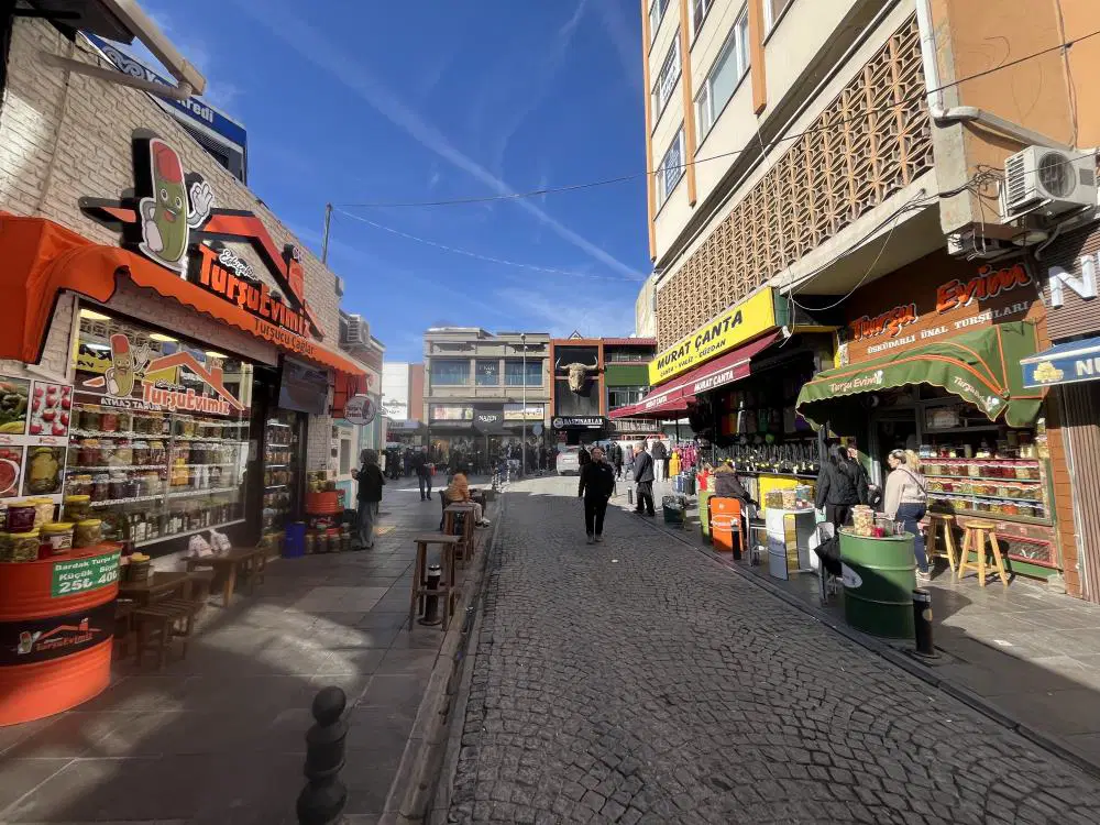 Kentin turistik yerlerinden olan Deliklitaş Mahallesi Değirmen Sokak üzerinde turşu satışı yapan çift, el ele vererek turşu kurmaktan satışa kadar bütün işleri birlikte yapıp geçimlerini sağladı.