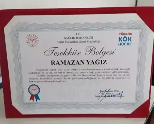 Şehit Yağız, Sağlık Bakanlığı tarafından gönderilen Teşekkür Belgesi’ni ve mutluluğunu, “Bundan yaklaşık 10 sene önce kök hücre (kemik iliği) bağışçısı olmak ister misiniz sorusuna evet dedim ve 10 yıl sonra geçtiğimiz Mart ayında kanser olan bir hasta ile uyumlu olduğum haberini aldım. Çeşitli testler sonrası Haziran ayında Ankara Bilkent Şehir Hastanesi’nde nakil gerçekleşti ve 3 ayı aşkın bir sürenin sonunda bugün hastanın taburcu olduğu bilgisini aldım.
