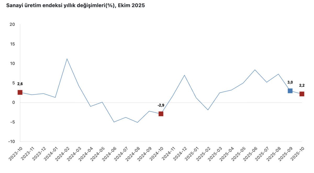 Sanayinin alt sektörleri incelendiğinde, 2025 yılı Ekim ayında madencilik ve taş ocakçılığı sektörü endeksi bir önceki aya göre yüzde 1,2 arttı, imalat sanayi sektörü endeksi yüzde 0,9 azaldı ve elektrik, gaz, buhar ve iklimlendirme üretimi ve dağıtımı sektörü endeksi yüzde 1,2 azaldı.